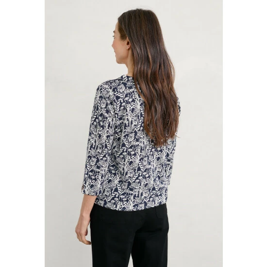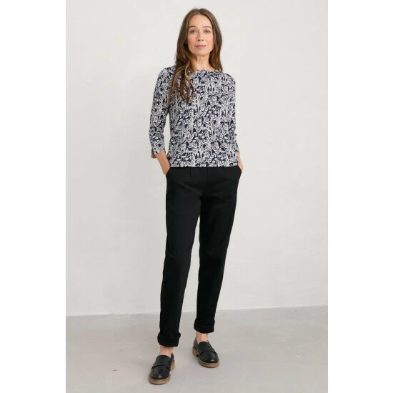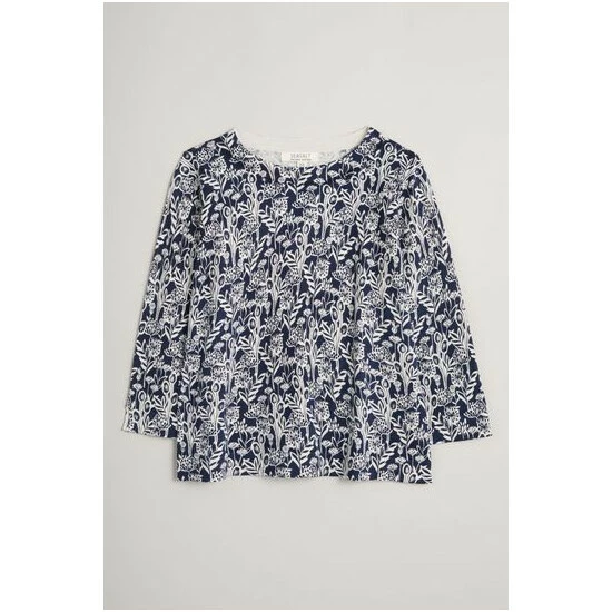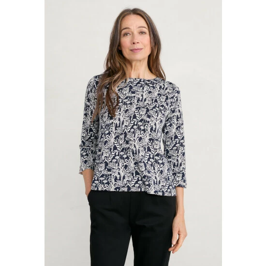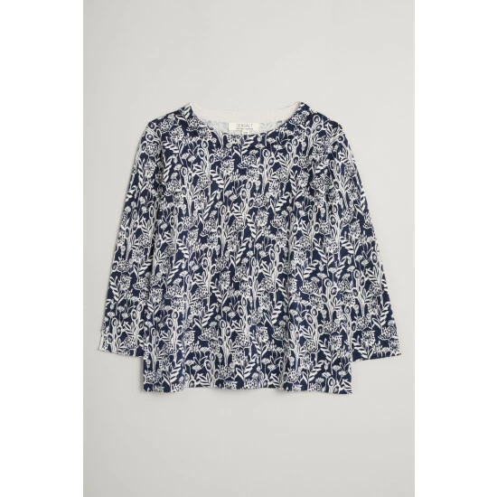 A jumper made from soft and breathable organic cotton, with a signature, handcrafted Seasalt print designed by their artists. Semi-fitted, with ¾ length sleeves and a round neckline. Perfect for the changing seasons. Choosing organic cotton helps to protect wildlife, workers and soil quality.